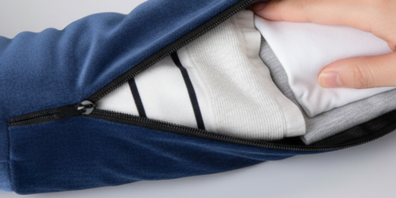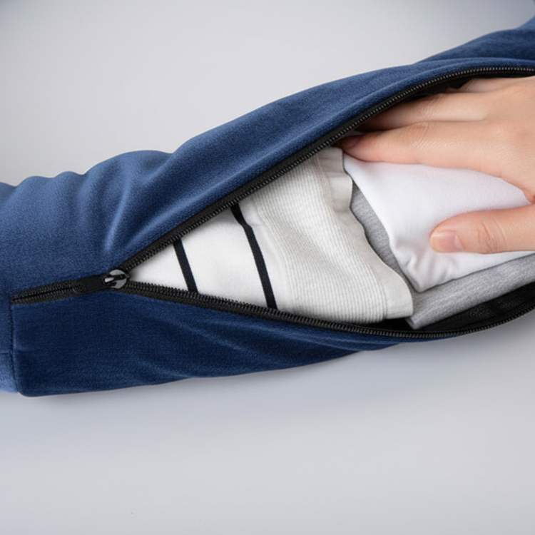 🥰 Soft velvet exterior for luxurious neck comfort 🧳 Hidden zippered compartment for neat T-shirt storage 🔒 Heavy-duty zipper for worry-free travel security 📎 Detachable strap for easy luggage or shoulder clipping
